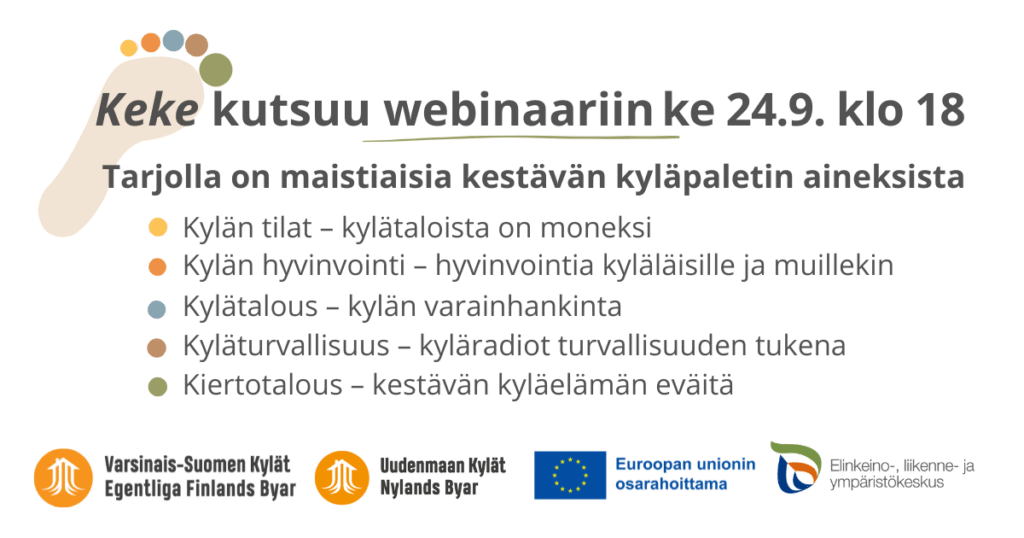 Osana Keke tulee kylään -hanketta järjestämme Kestävän kehityksen viikolla webinaarin hankkeen eri osa-alueista eli kyläpaletin osista.
