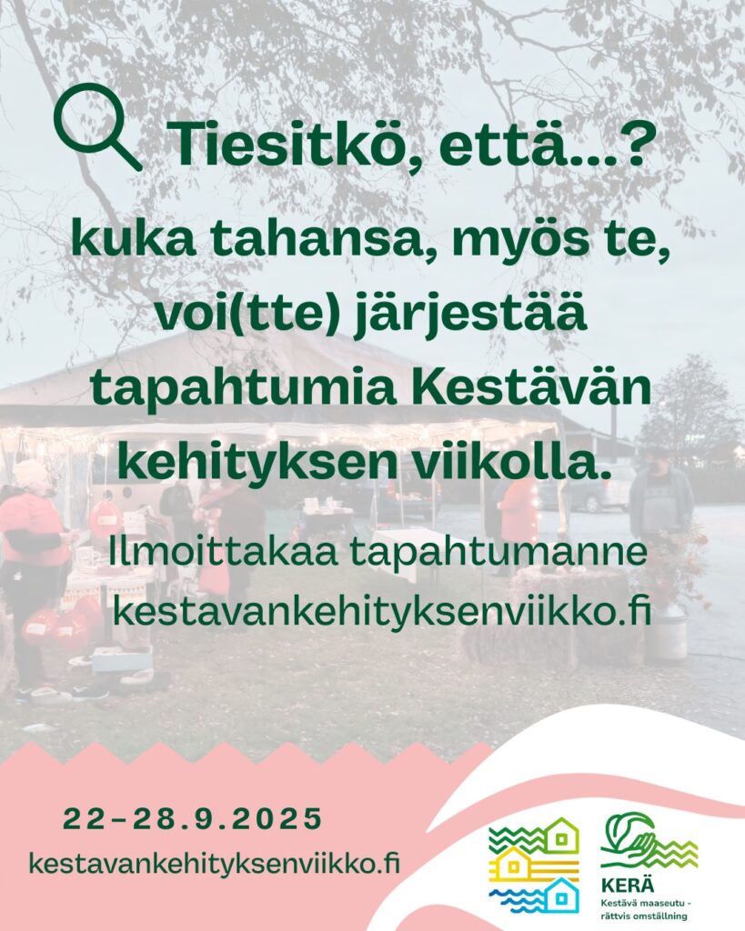 Varsinais-Suomen Kylät » Kylillä nyt » Kestävän kehityksen viikko tulee taas! Kestävän kehityksen viikko tulee taas!2.9.2025 Koko maa valmistautuu Kestävän kehityksen viikkoon – tapahtumia järjestetään jo nyt Lieksasta Maarianhaminaan, 22.-28.9! Vielä ehditte mukaan! Ilmoita oma tapahtumanne osoitteessa kestavankehityksenviikko.fi← EDIT: Kartläggningen av byahus – svar senast på 30.11.Hållbarhetsveckan är här igen! →