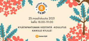 Kaikille kylille ja kyläläisille avoin Avoimet kylät 2021 koulutus järjestetään 25.3.2021 kello 18-19. Koulutus järjestetään etäyhteyksien kautta Teams-alustalla. Tapahtuma on maksuton ja teemana on kylätapahtuman viestintä. Miksi kyläyhdisistyksen kannattaa päivittää tapahtumansa tiedot medialle, verkkosivuille ja somekanaviin? Kannattaako perinteistä tiedotetta enää lähettää paikallismediaan? Miten tuotan sisältöä somekanaviin? Kouluttajina Suomen Kylien viestintäpäällikkö Anssi Ketonen ja viestintäverkostosuunnittelija Anuliina…