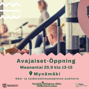 Kestävän Kehityksen Viikko 25.9.-1.10. Kestävän kehityksen viikolla haluamme luoda yhdessä yhdistysten, kuntien, yritysten ja muiden sidosryhmien kanssa tapahtumaviikon, jossa nostetaan esille kaikki hyvät esimerkit maaseudulla tehdystä kestävän kehityksen työstä. Varsinais-Suomi on yksi kymmenestä maakunnasta, jossa viikko järjestetään. Viikon valtakunnallinen avajaistapahtuma pidetään Mynämäessä 25.9. Tule mukaan! Ilmoita tapahtumasi 15.9. mennessä: https://varsinais-suomi.kestavankehityksenviikko.fi/tule-mukaan/ * Mieti, mitä sellaista voisitte järjestää,…